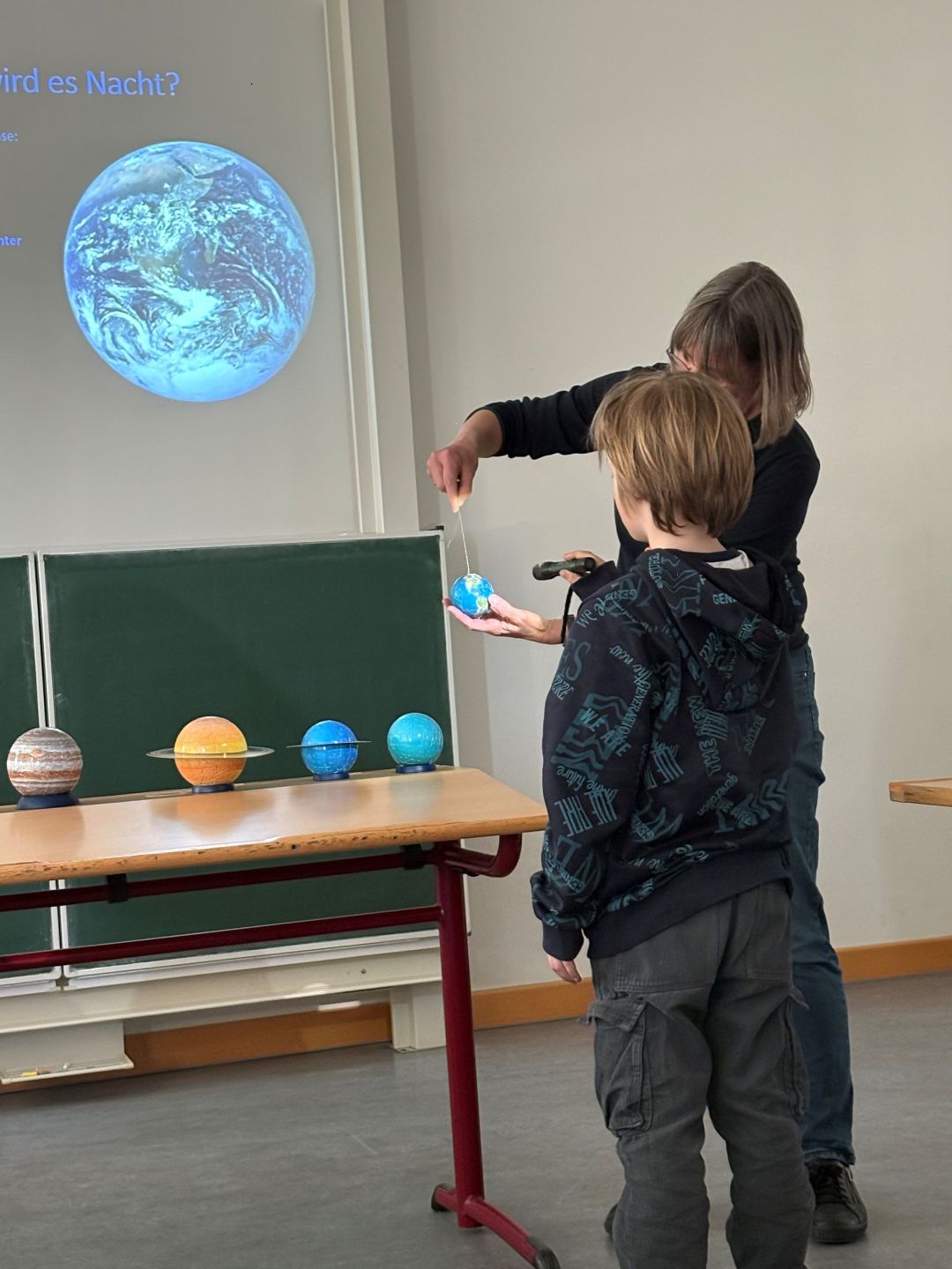 Die Reise startet auf der Erde. Als Erstes finden wir heraus, warum es Tag und Nacht gibt und warum es nicht immer Sommer ist. Danach erforschen wir das Sonnensystem und lernen den Unterschied zwischen der Sonne und den Planeten kennen. Wir machen ein Modell unseres Sonnensystems und bekommen so eine Vorstellung über seine enormen Dimensionen. In diesem Modell stellen wir uns auch die Entfernungen zu den nächsten Sternen bis hin zu den Galaxien vor.
