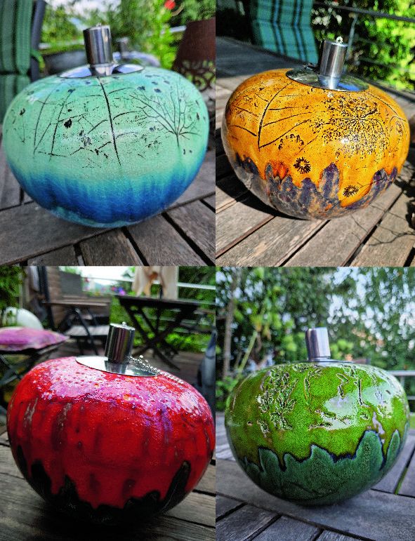 Wir gestalten in diesem Workshop, zusammen, „Schritt für Schritt“ eine Tischfackel mit ca. 20 cm Durchmesser. Es können unterschiedliche Muster, Gräser, Formen eingedrückt werden,  um tolle Effekte zu erzielen. Ein Highlight ist die Möglichkeit Glasscherben mit einzuschmelzen. Du kannst zwischen einem Edelstahl-Öleinsatz oder einem Teelichteinsatz wählen. Der Glasiertermin wird dann in der Gruppe gemeinsam ausgemacht. In der Kursgebühr sind bereits Material-, Brenn- und Glasurkosten enthalten. Getränke und Süßes inbegriffen.